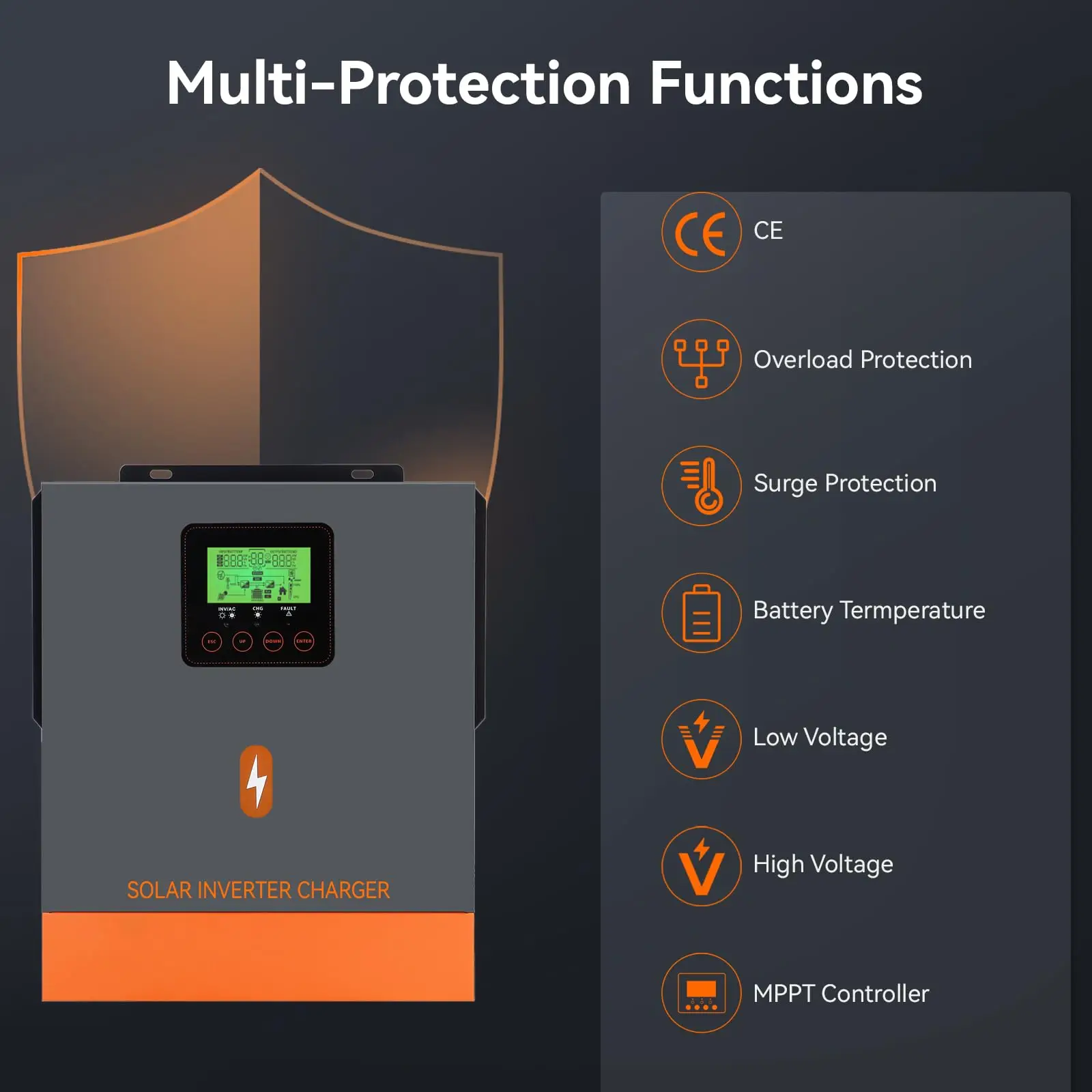 นี่คืออินเวอร์เตอร์/เครื่องชาร์จแบบมัลติฟังก์ชั่น ซึ่งรวมฟังก์ชันของอินเวอร์เตอร์ เครื่องชาร์จพลังงานแสงอาทิตย์ และเครื่องชาร์จแบตเตอรี่เข้าด้วยกัน เพื่อให้การสนับสนุนพลังงานอย่างต่อเนื่องด้วยขนาดพกพาหน้าจอ LCD ที่ครบครันมาพร้อมกับปุ่มควบคุมที่ผู้ใช้งานสามารถปรับตั้งค่าได้ตามความต้องการและใช้งานได้อย่างสะดวก เช่น การตั้งค่ากระแสไฟสำหรับการชาร์จแบตเตอรี่, การกำหนดลำดับความสำคัญระหว่างเครื่องชาร์จไฟฟ้ากระแสสลับ (AC) และพลังงานแสงอาทิตย์, รวมถึงการตั้งค่าช่วงแรงดันไฟฟ้าที่ยอมรับได้ตามการใช้งานในแต่ละประเภท
