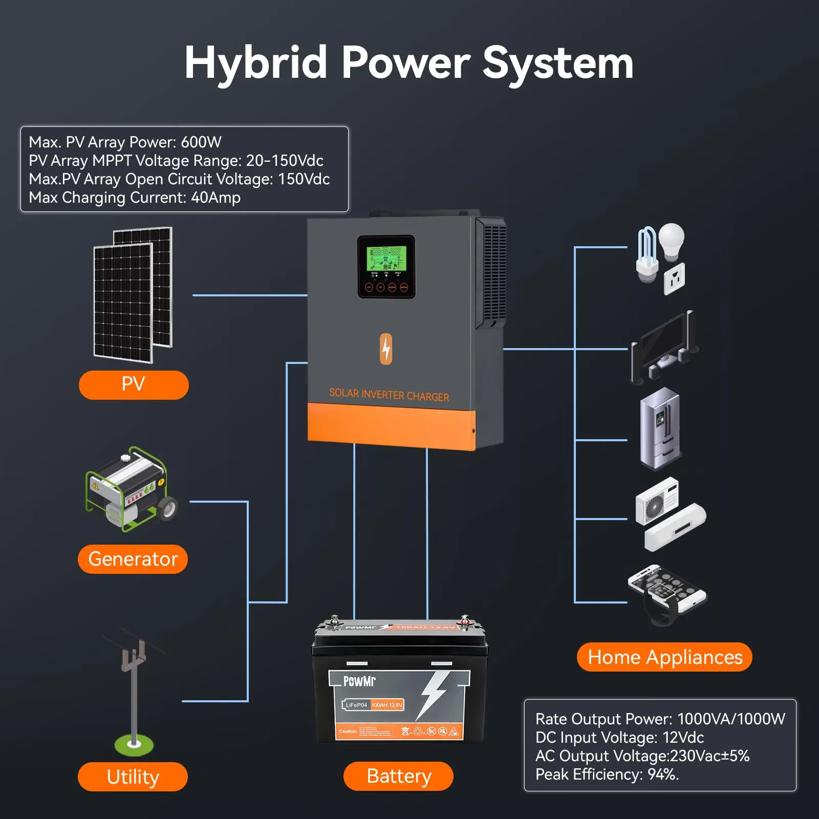 อินเวอร์เตอร์ไฮบริดพลังงานแสงอาทิตย์ PowMr 1.5KW 12V 220V พร้อมคลื่นไซน์บริสุทธิ์ ตัวควบคุมการชาร์จพลังงานแสงอาทิตย์ MPPT 80A รองรับแผงโซลาร์เซลล์แรงดันต่ำ 30-150VDC