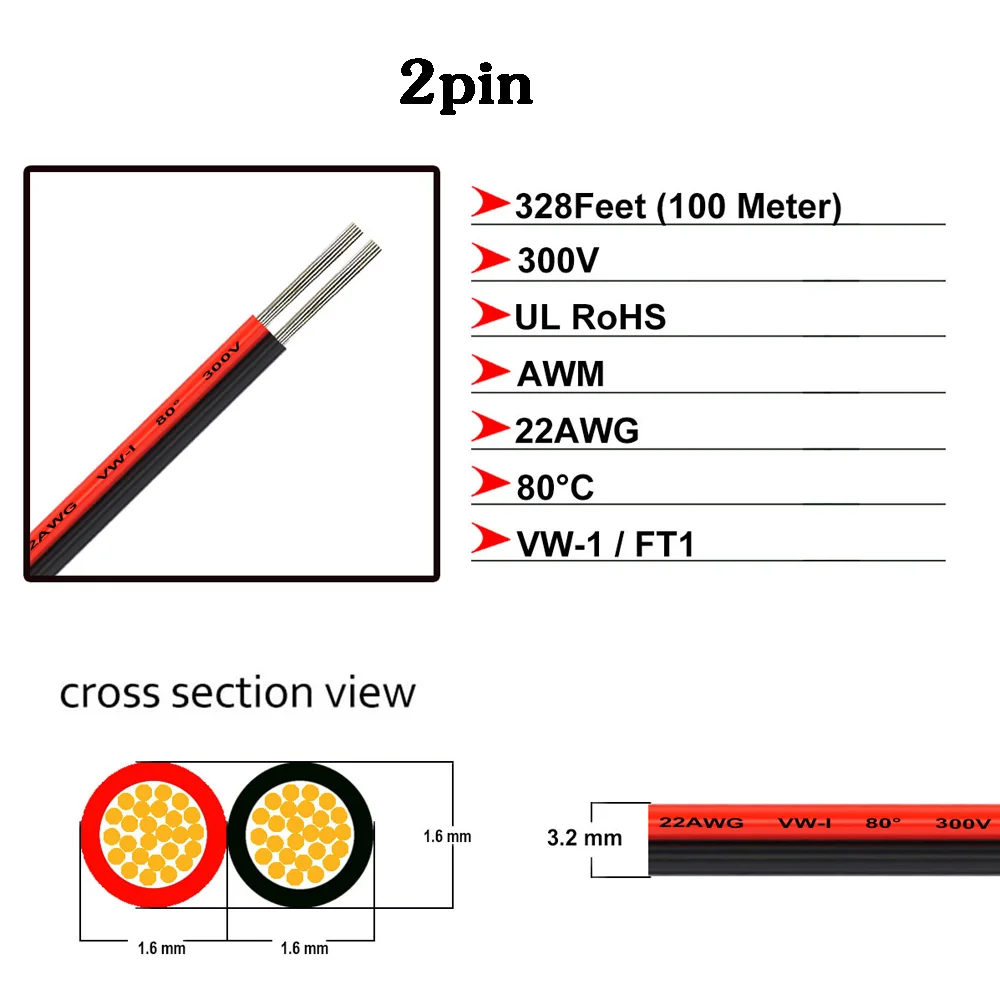 2 พิน 3 พิน 4 พิน 5 พิน 6 พินยืดหยุ่น LED สาย 22AWG สายไฟ PVC ฉนวนสีแดงสีดำสำหรับ WS2812B WS2813 5050 แถบ LED จาก 5 รีวิว
