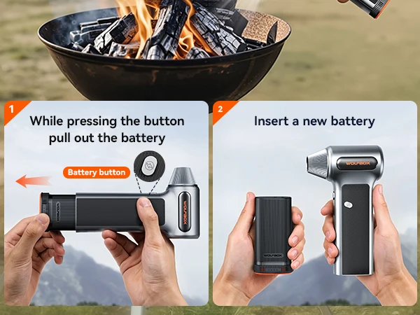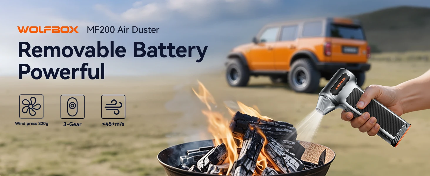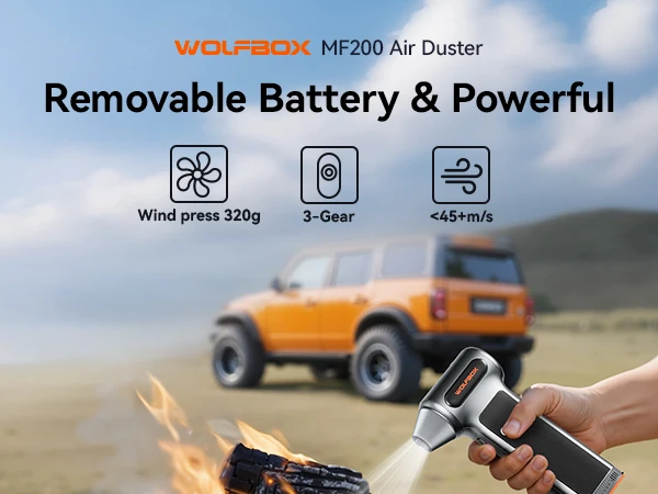 WOLFBOX MF200 เครื่องเป่าลมไฟฟ้า-แรงลม 320 กรัม, มอเตอร์ไร้แปรงถ่านแบบชาร์จไฟได้ 3 ระดับ สำหรับรถยนต์/คอมพิวเตอร์/บ้าน/กลางแจ้ง
