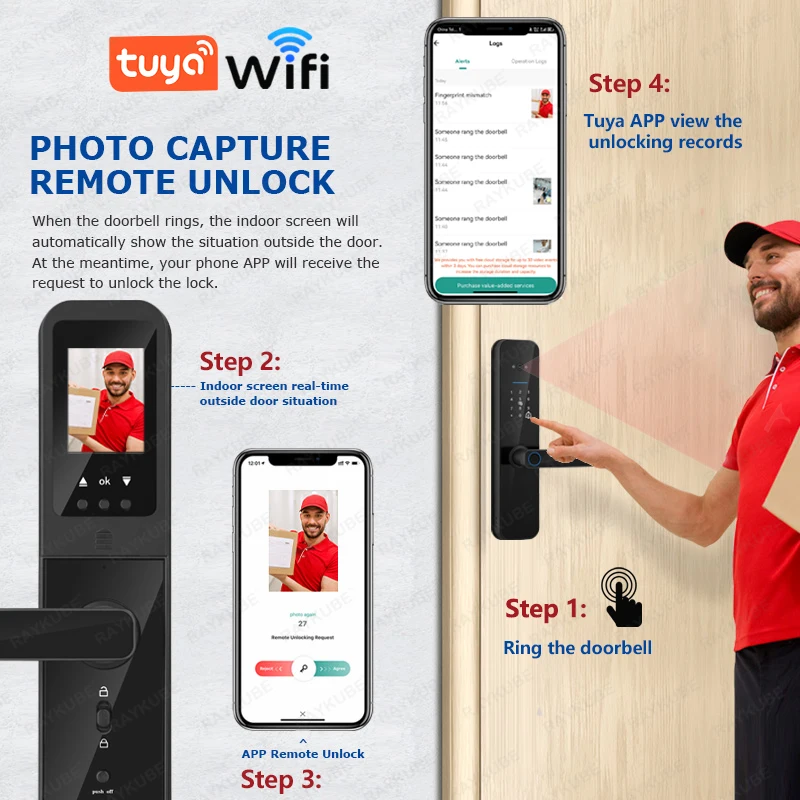 RAYKUBE F008 Tuya Wifi peephole HD กล้องลายนิ้วมือดิจิตอลสมาร์ทประตูล็อค Doorbell ในตัว Gateway APP ปลดล็อคระยะไกล