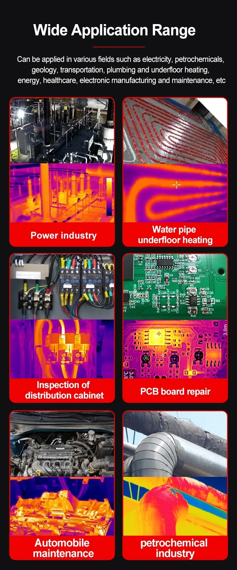 – suitable for: underfloor heating leaks, HVAC maintenance, power system inspections, electronic repairs, and industrial inspect.
