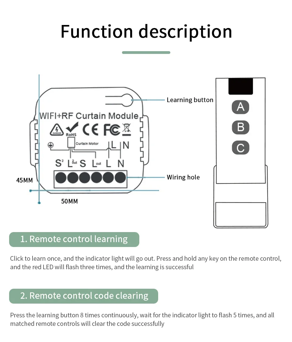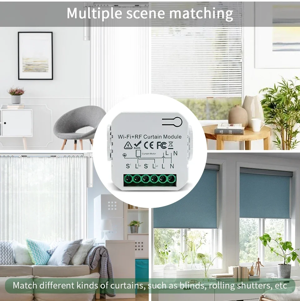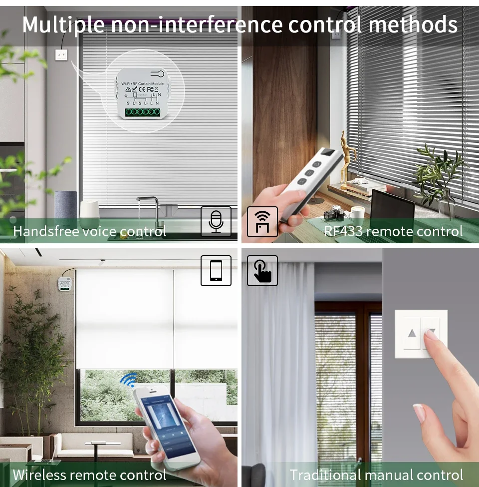 [RF และรีโมทคอนโทรลไร้สายพร้อมโหมดจับคู่ง่ายกว่ามาก] สําหรับการเพิ่มอุปกรณ์ที่เชื่อมต่อ WiFi และ Bluetooth: สามารถควบคุมอุปกรณ์ที่เชื่อมต่อของคุณบนสมาร์ทโฟนของคุณจากระยะไกลได้ไม่ว่าคุณจะอยู่ที่ไหน(เข้ากันได้กับ Android และ iOS สําหรับ Smart Life และแอป Tuya)ที่สําคัญโมดูลสวิตช์ม่านนี้มีความถี่ RF433 ในตัว จึงสามารถควบคุมได้ด้วยสวิตช์ระยะไกล