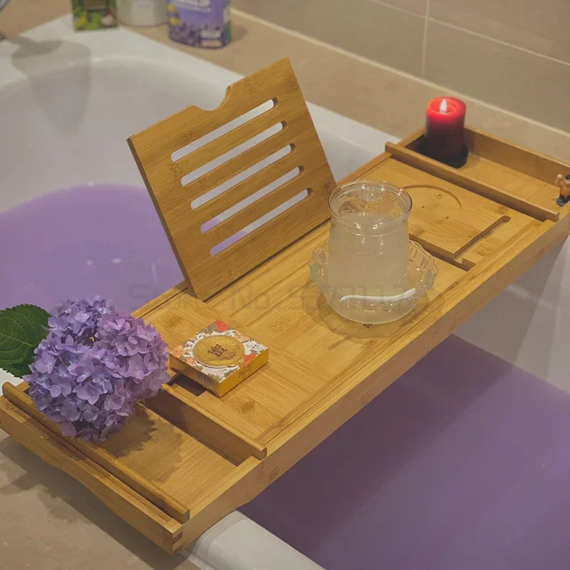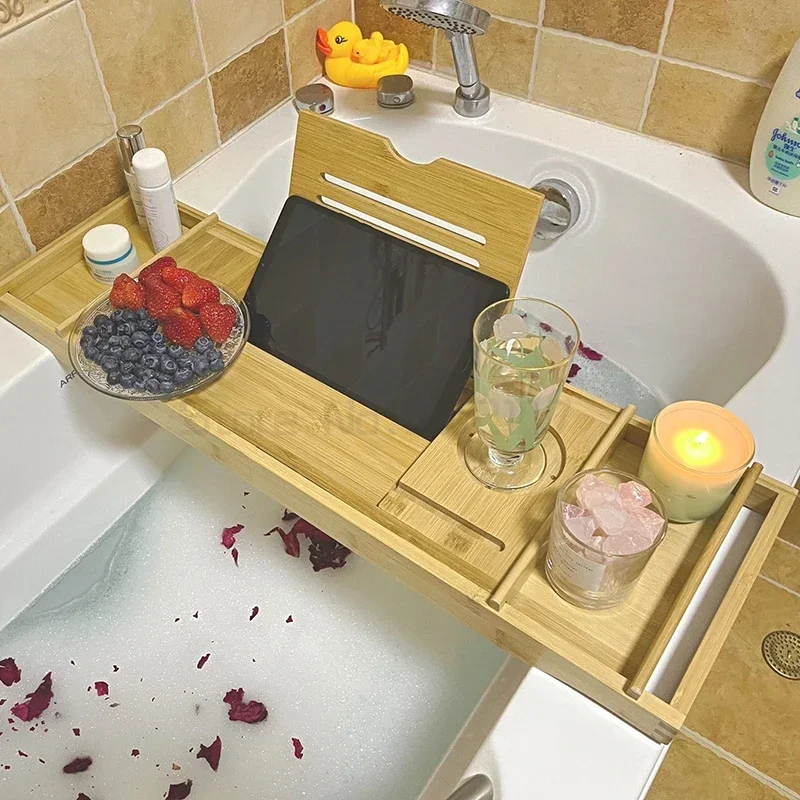 ถาดวางของในอ่างอาบน้ำไม้ไผ่, ชั้นวางอ่างอาบน้ำปรับระดับได้, ถาดหรูหราสำหรับการผ่อนคลายและจัดระเบียบ