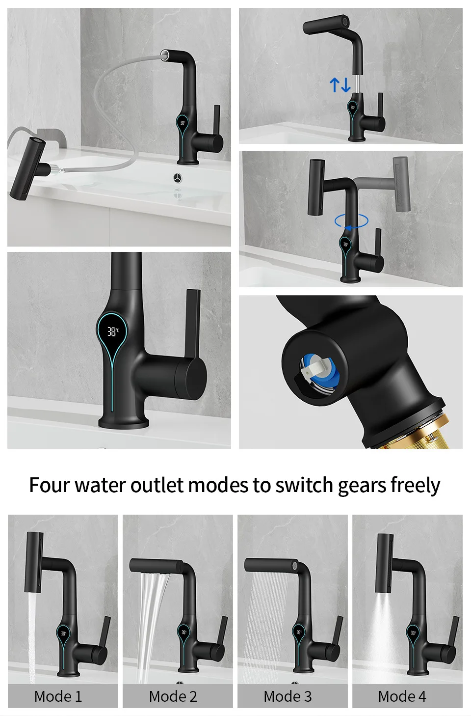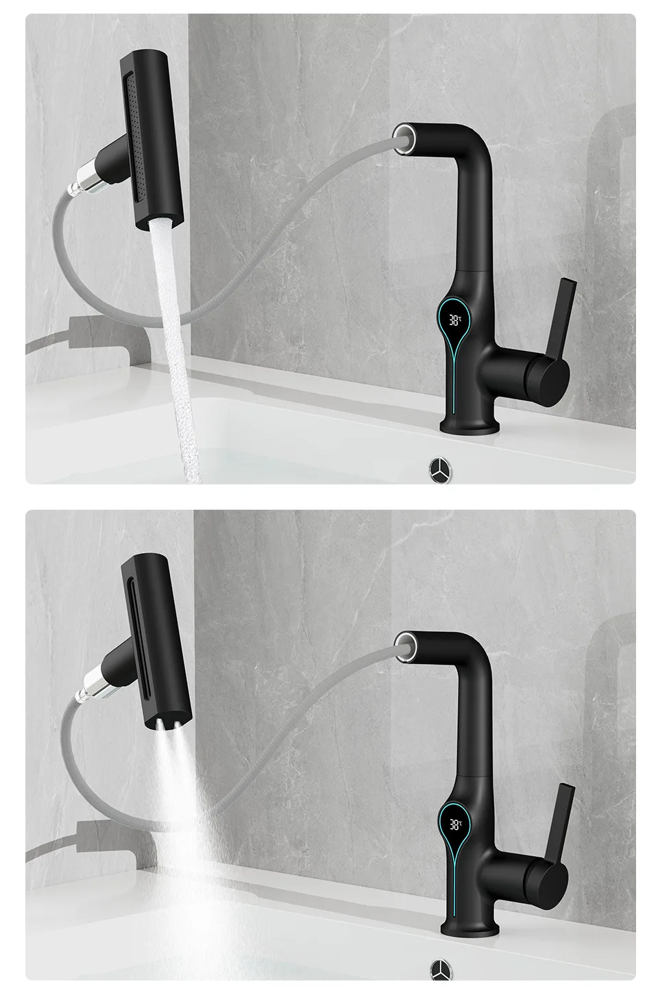 ก๊อกน้ำอเนกประสงค์แบบน้ำตก 4 โหมด พร้อมหัวฉีดแบบดึงออกได้ สำหรับห้องน้ำและห้องครัว พร้อมหน้าจอ LED อัจฉริยะ