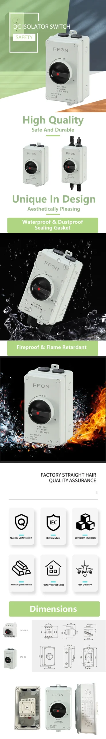 สวิตช์ตัดวงจรแบบหมุนสำหรับแผงโซลาร์เซลล์ PV DC 1200V 16A 32A พร้อมมือหมุน กันน้ำ สำหรับใช้งานกลางแจ้ง