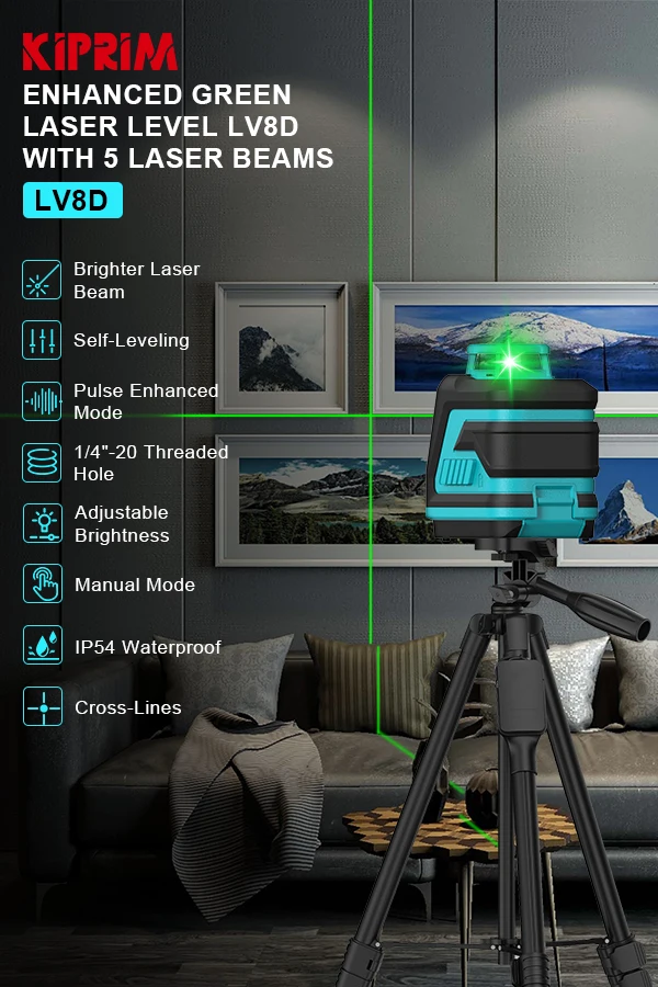 Kiprim ระดับเลเซอร์ 2 เส้น/5 เส้น 360 ระดับอัตโนมัติเครื่องมือก่อสร้างอุปกรณ์สีเขียว Professional CROSS Laser