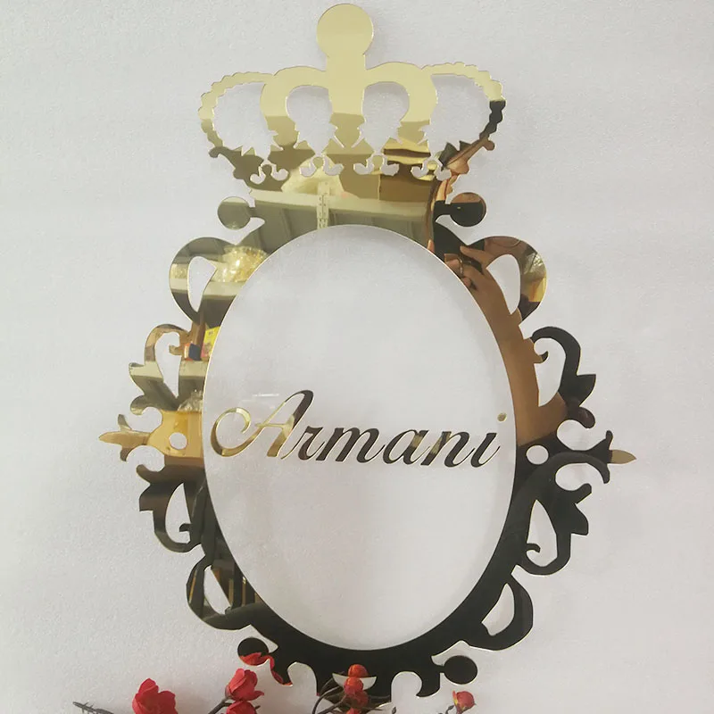 กระจกสีทองชื่อป้ายแต่งงานทำจากไม้อะคริลิคทำจากไม้ออกแบบได้ตามต้องการลายเซ็นของทารกอุปกรณ์ตกแต่งห้องปาร์ตี้ตัดด้วยเลเซอร์