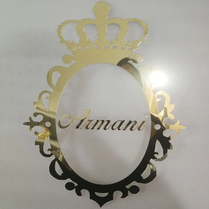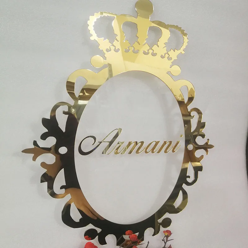 กระจกสีทองชื่อป้ายแต่งงานทำจากไม้อะคริลิคทำจากไม้ออกแบบได้ตามต้องการลายเซ็นของทารกอุปกรณ์ตกแต่งห้องปาร์ตี้ตัดด้วยเลเซอร์