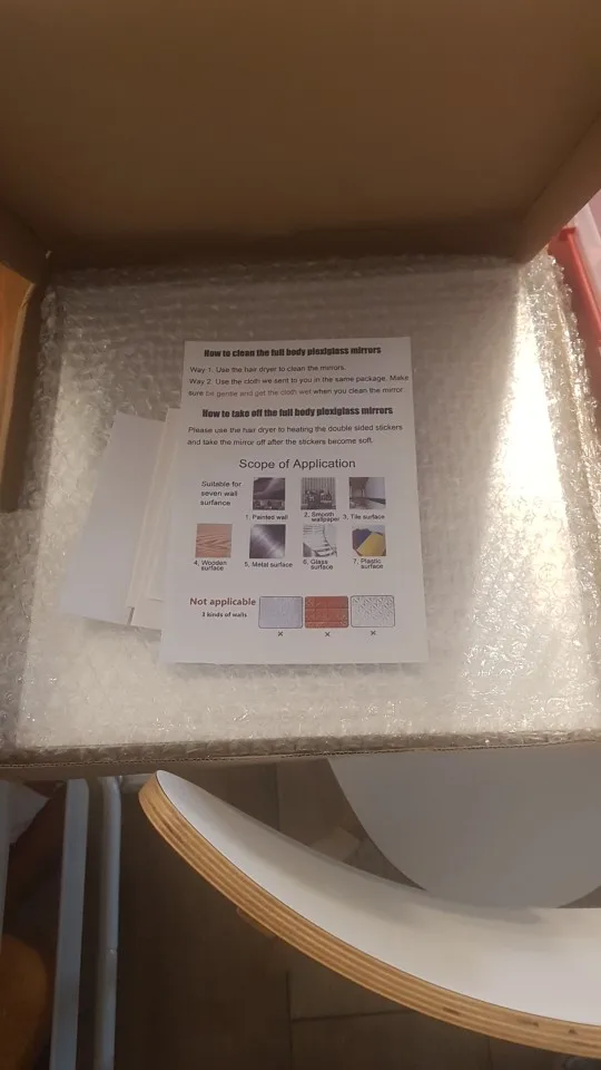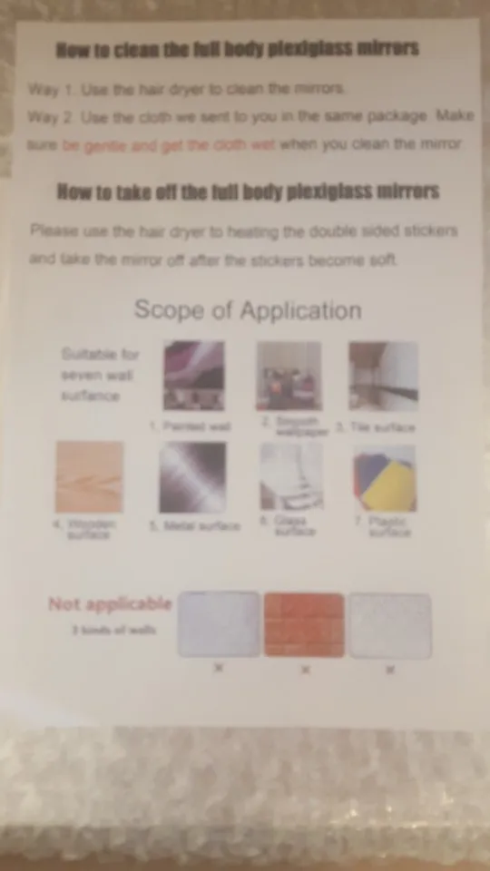 • (ติดตั้งง่าย ) : ไม่ต้องเจาะ & ไม่มีความเสียหายจากผนัง แพ็คเกจมาพร้อมกับเทปโฟมสองหน้าอันทรงพลัง รับประกัน . สามารถติดตั้งบนผนังเรียบได้ง่าย ผนังสีลาเท็กซ์ หรือประตูไม้ แต่ไม่ใช้เพื่อผนังไม่สม่ําเสมอ เมื่อคุณติดสิ่งนี้บนพื้นผิวเรียบ มันจะให้การสะท้อนที่สมบูรณ์แบบ! หลังจากติดตั้งกรุณาฉีกฟิล์มป้องกันบนพื้นผิว