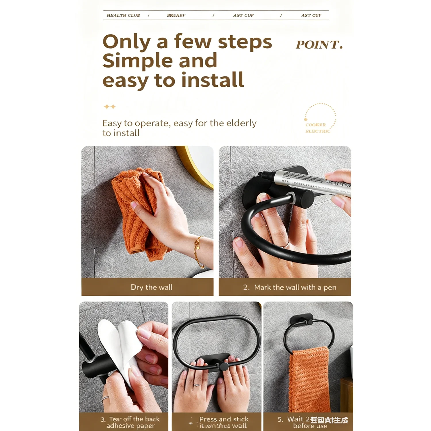 ชุดอุปกรณ์ฮาร์ดแวร์สำหรับห้องน้ำนี้มาพร้อมกับวิธีการติดตั้งแบบกาวในตัว ช่วยให้ติดตั้งได้ง่ายโดยไม่ต้องใช้เครื่องมือหรือความช่วยเหลือจากผู้เชี่ยวชาญ