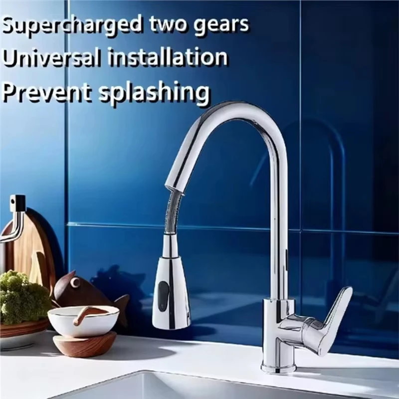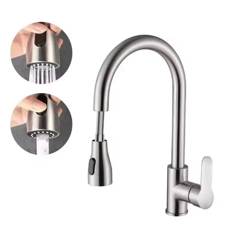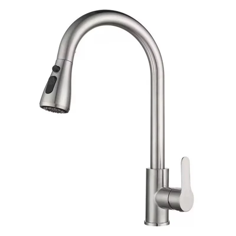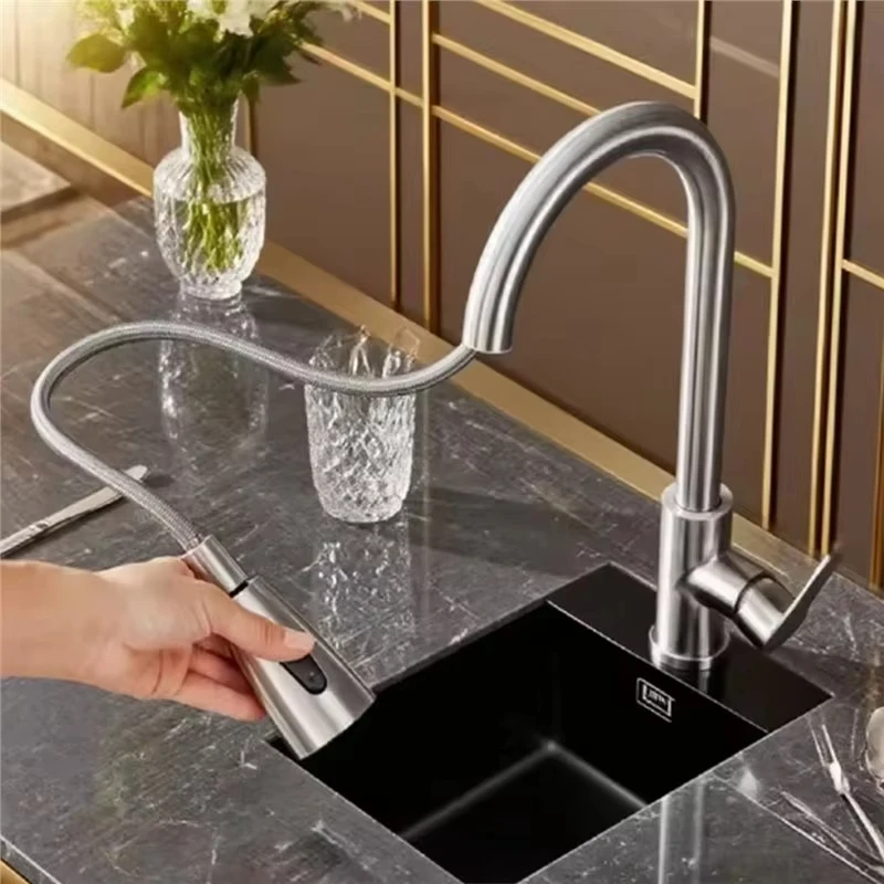 ก๊อกน้ำอ่างล้างจานแบบดึงออกได้ โครเมียมขัดเงา ก๊อกผสมอ่างล้างจานแบบดึงลง สแตนเลส 304 ก๊อกน้ำร้อน-เย็นสำหรับห้องครัว
