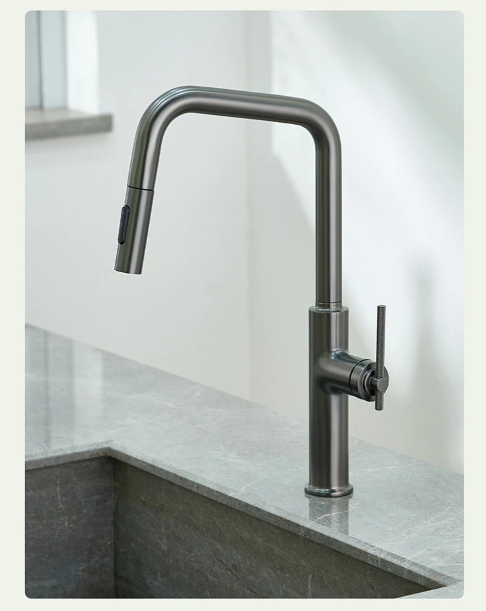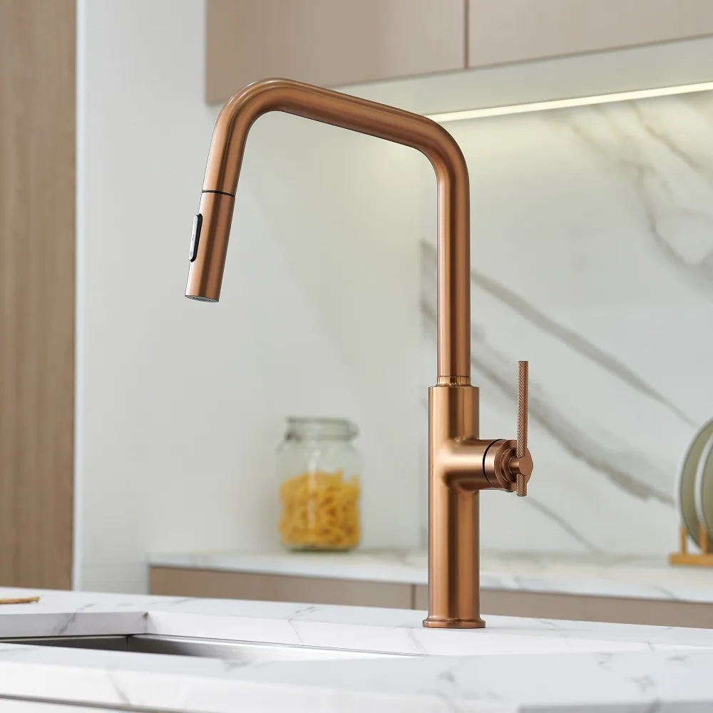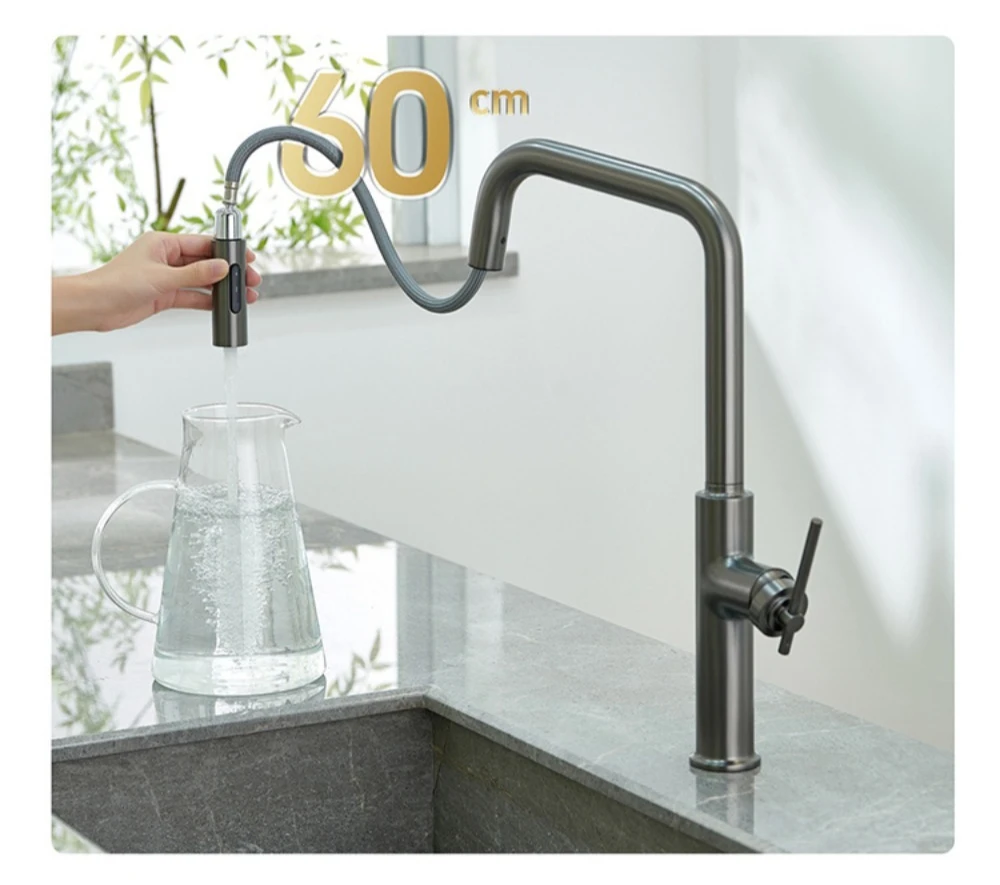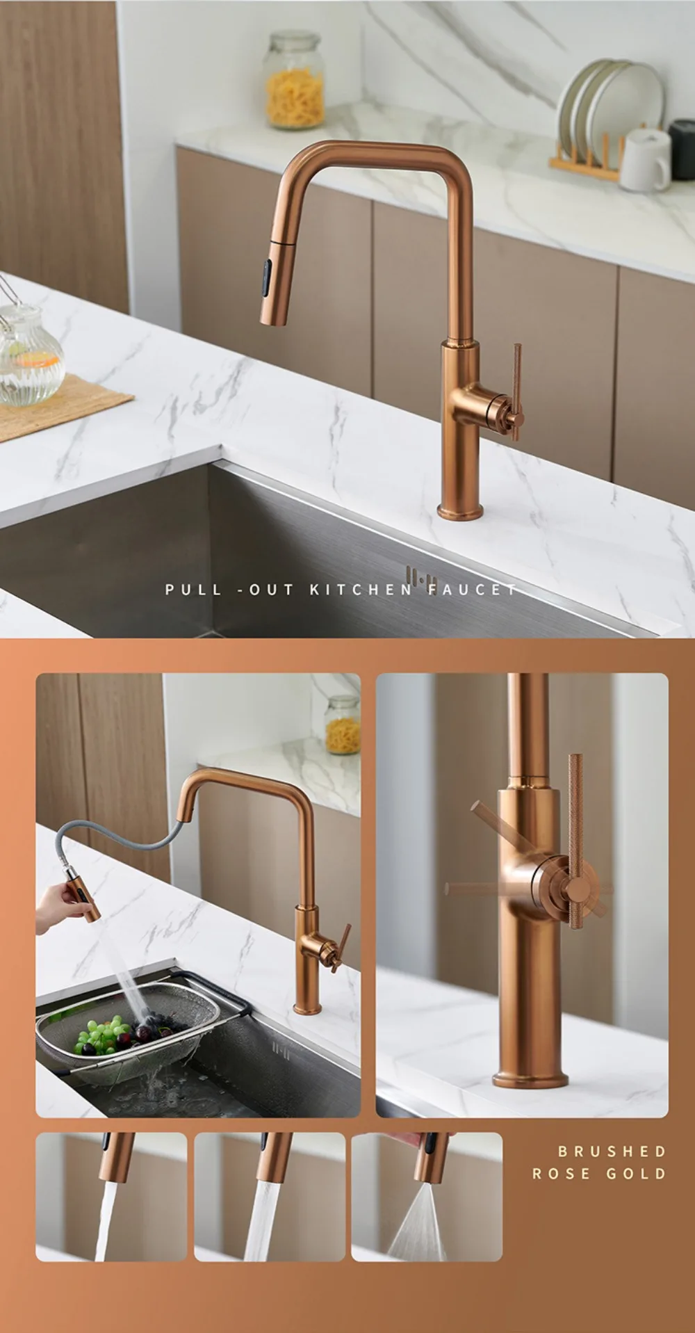 ก๊อกน้ำห้องครัวแบบดึงออกได้ สีโรสโกลด์ขัดเงา น้ำร้อนน้ำเย็น ฟังก์ชั่นหลากหลาย