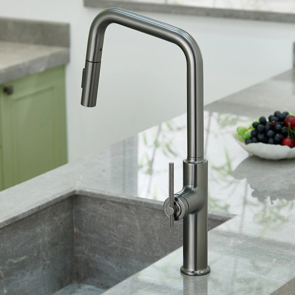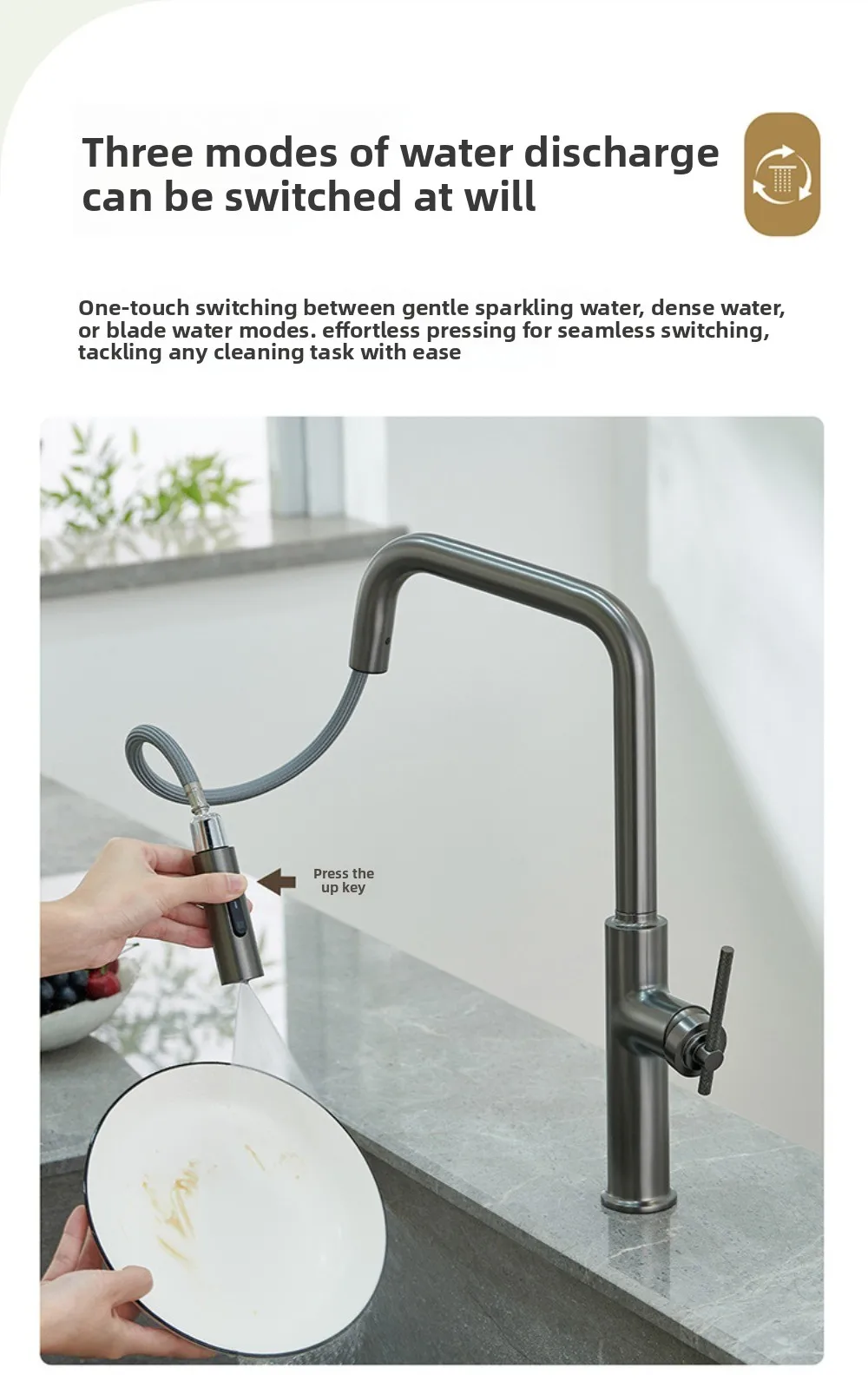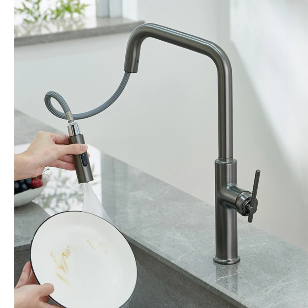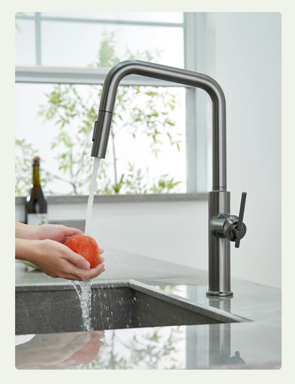 ก๊อกน้ำห้องครัวแบบดึงออกได้ สีโรสโกลด์ขัดเงา น้ำร้อนน้ำเย็น ฟังก์ชั่นหลากหลาย