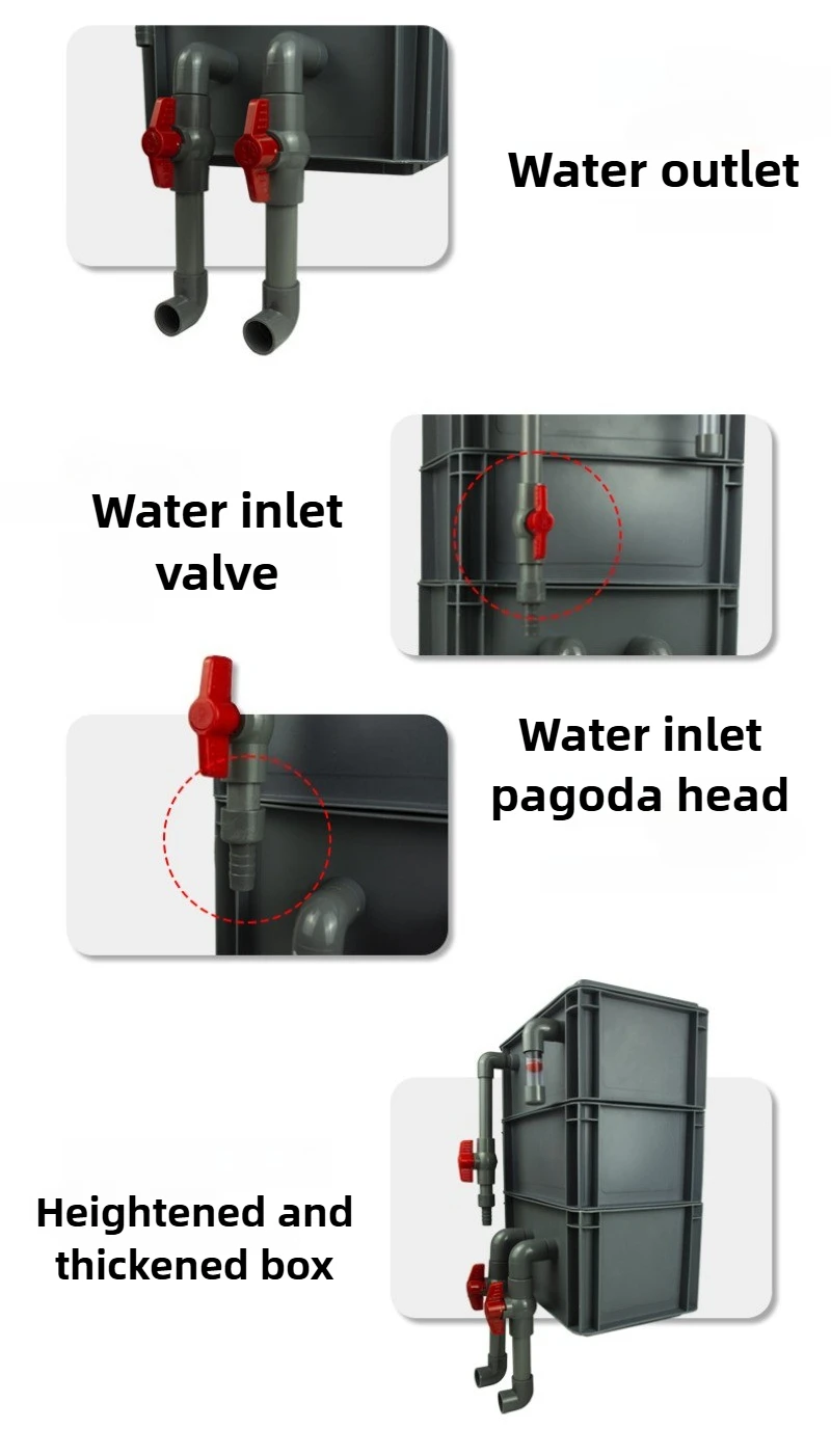 ข้อมูลสินค้า: 1.วัสดุ: พลาสติก 2.การทำน้ำให้บริสุทธิ์| การกรอง| วัฒนธรรม| การไหลเวียน| ออกซิเจน 3.วัฒนธรรมแบบหมุนเวียน การกรองที่แข็งแกร่ง 4.สถานการณ์ที่เกี่ยวข้อง: ในร่ม กลางแจ้ง บ่อปลา ฯลฯ