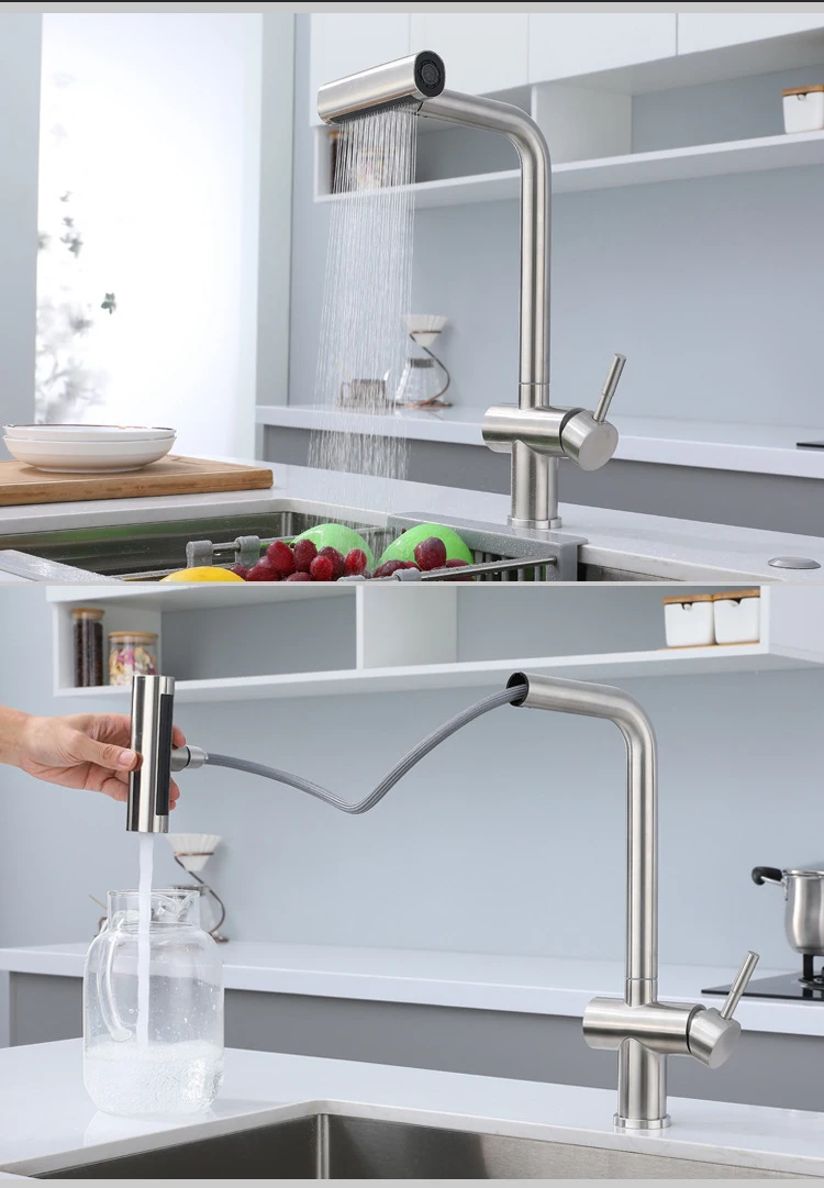 ☛ หัวฉีดแบบดึงออก: หัวฉีดและหัวพ่นหมุนได้ 360 องศา, หัวพ่นแบบโค้งสูงหมุนได้ 360 องศา สามารถให้การล้างอ่างล้างจานได้รอบด้าน, ก๊อกน้ำแบบมือจับเดี่ยวสามารถควบคุมอุณหภูมิและปริมาณน้ำได้สะดวกยิ่งขึ้นก๊อกน้ำอเนกประสงค์สำหรับอ่างล้างจานช่วยอำนวยความสะดวกในงานต่างๆ ภายในพื้นที่ครัว