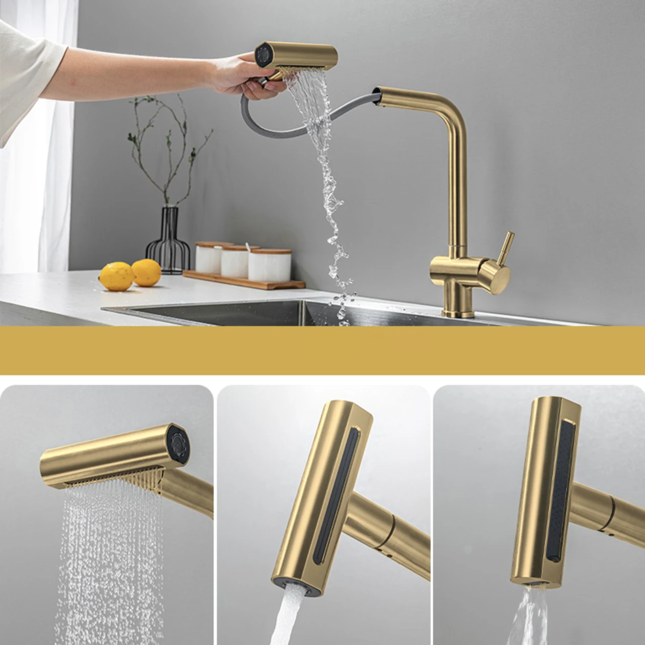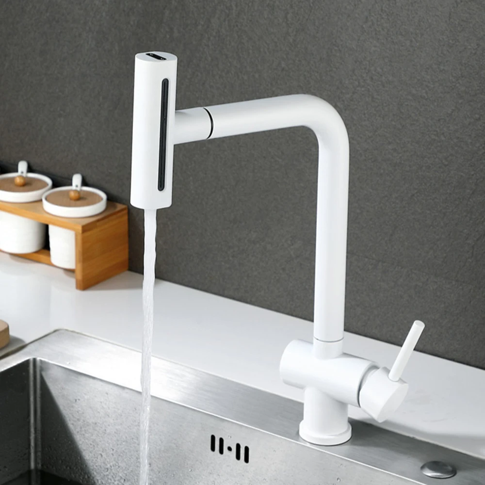☛ หัวฉีดแบบดึงออก: หัวฉีดและหัวพ่นหมุนได้ 360 องศา, หัวพ่นแบบโค้งสูงหมุนได้ 360 องศา สามารถให้การล้างอ่างล้างจานได้รอบด้าน, ก๊อกน้ำแบบมือจับเดี่ยวสามารถควบคุมอุณหภูมิและปริมาณน้ำได้สะดวกยิ่งขึ้นก๊อกน้ำอเนกประสงค์สำหรับอ่างล้างจานช่วยอำนวยความสะดวกในงานต่างๆ ภายในพื้นที่ครัว
