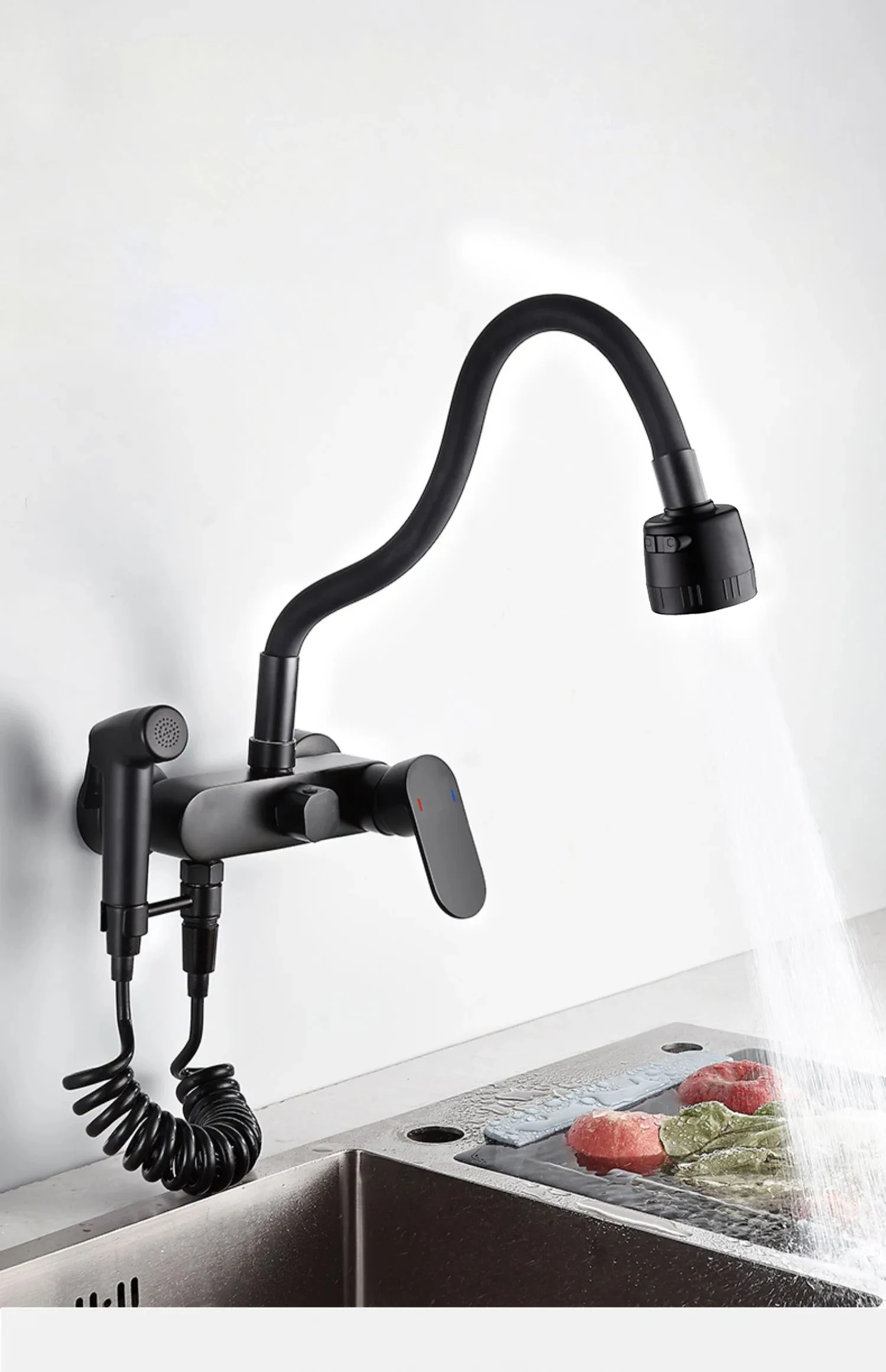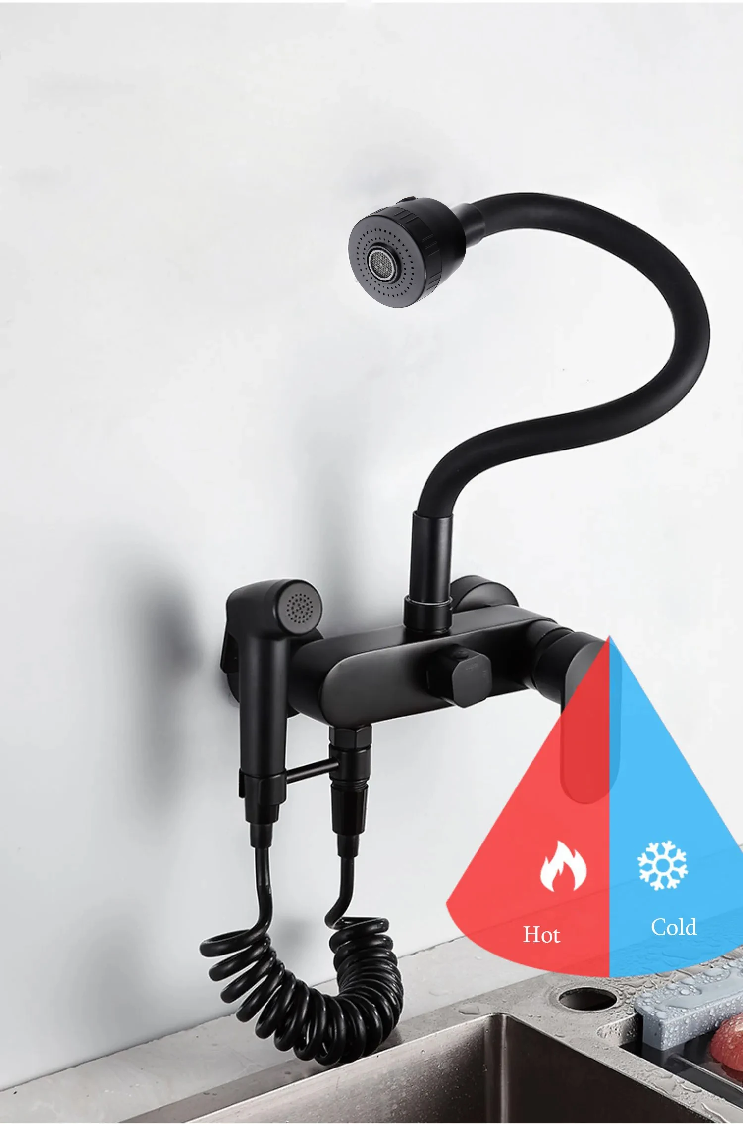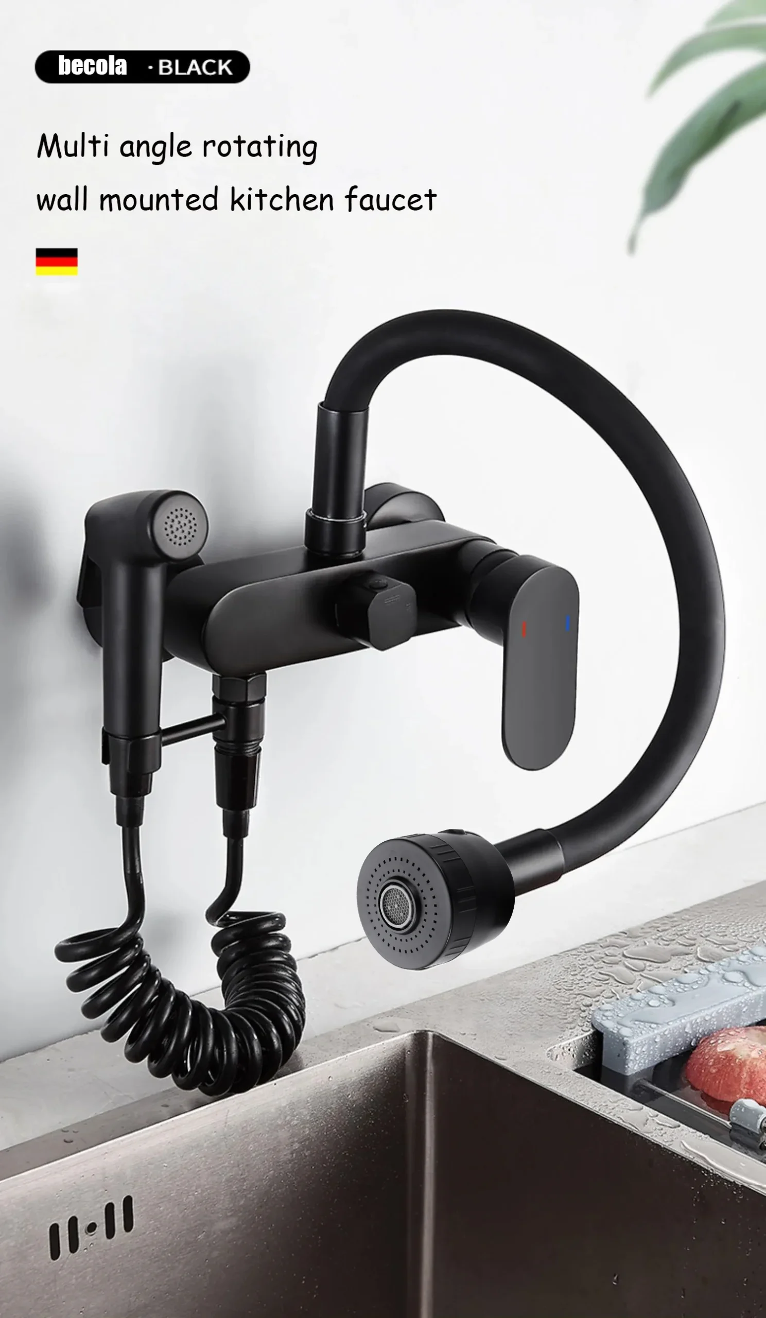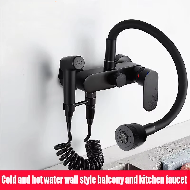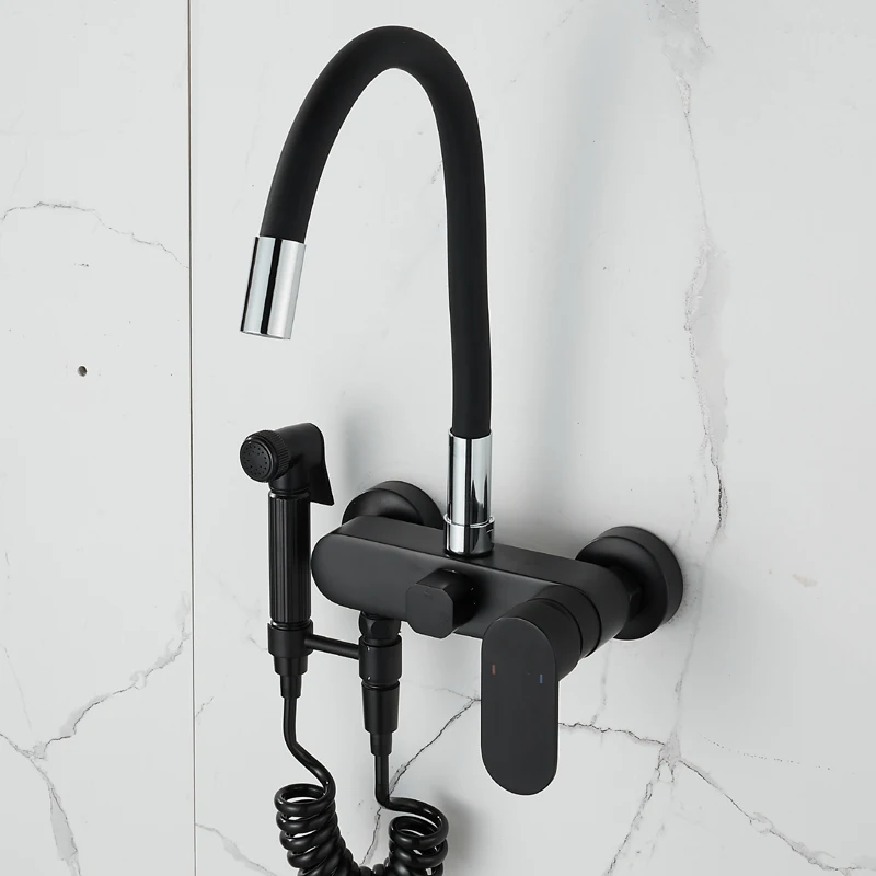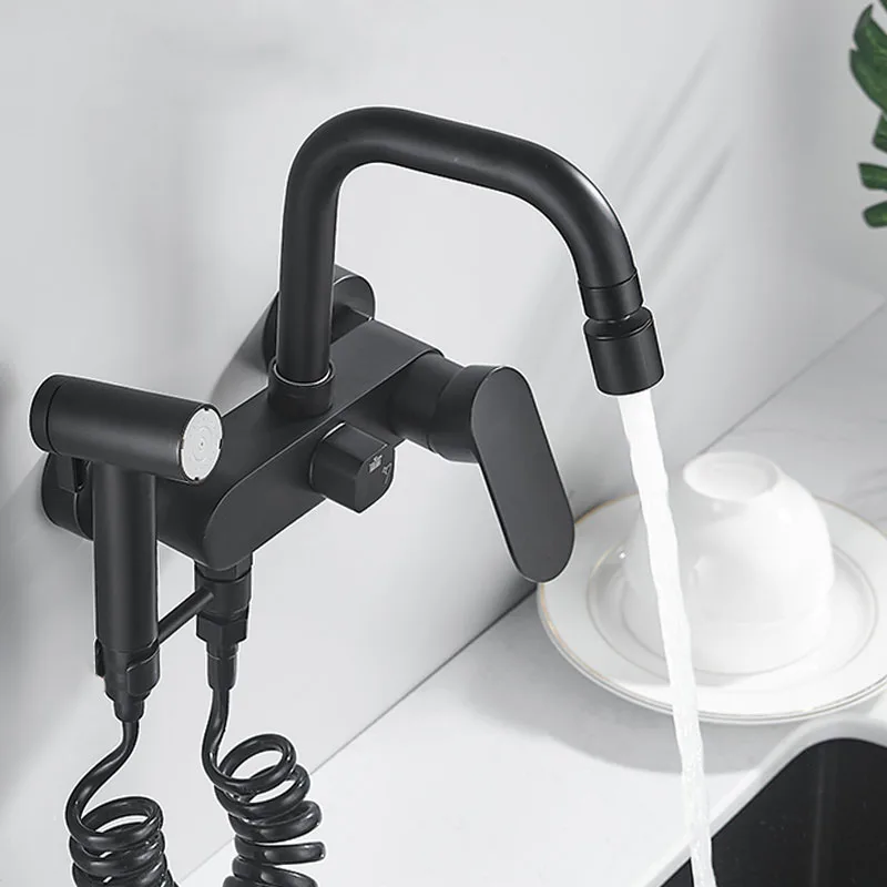 BAKALA Matte สีดําก๊อกน้ําห้องครัวติดผนังทองเหลือง 360 หมุน Spout เดี่ยวร้อนเย็นน้ําผสม Sprayer หัว