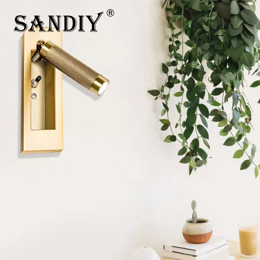 Sandiy โคมไฟติดผนังข้างเตียงมีสวิตช์ไฟอ่านหนังสือไฟติดห้องนอนหมุนได้สำหรับตกแต่งห้องโรงแรมนอร์ดิกไฟติดเพดานทอง