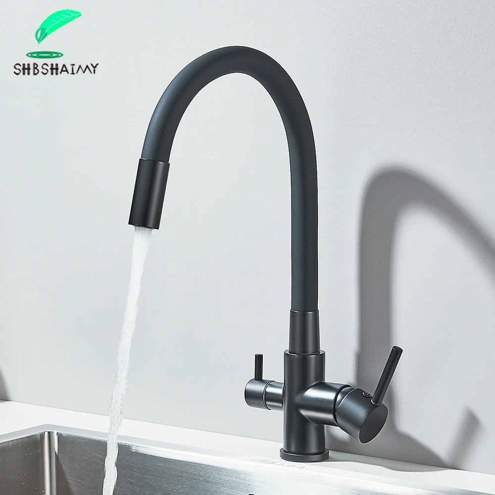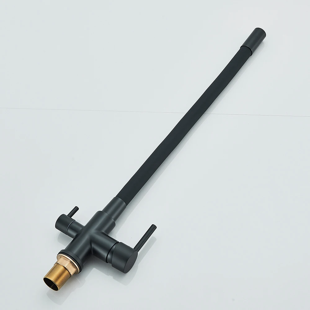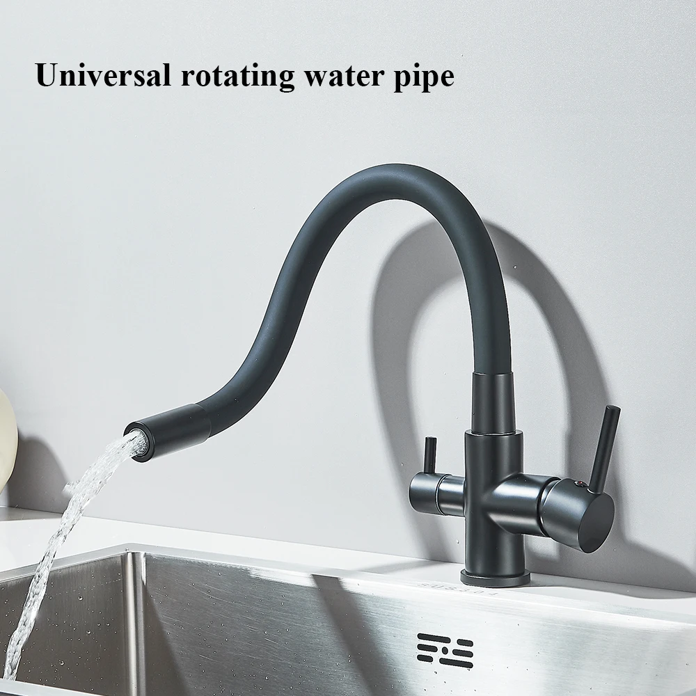 สีดําน้ําบริสุทธิ์ก๊อกน้ําห้องครัวท่อยืดหยุ่น Daul จับเย็นน้ําร้อนผสมน้ําดื่มบริสุทธิ์กรองน้ําแตะหมุนก๊อก