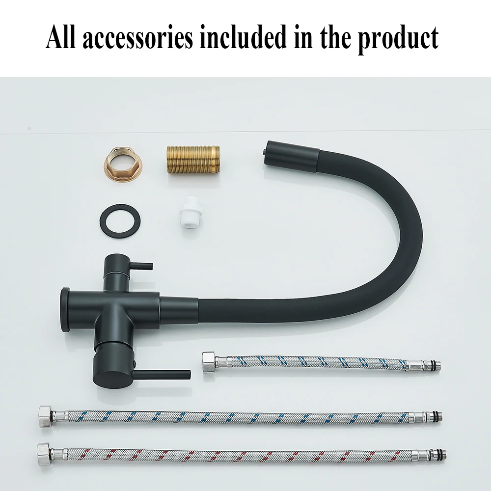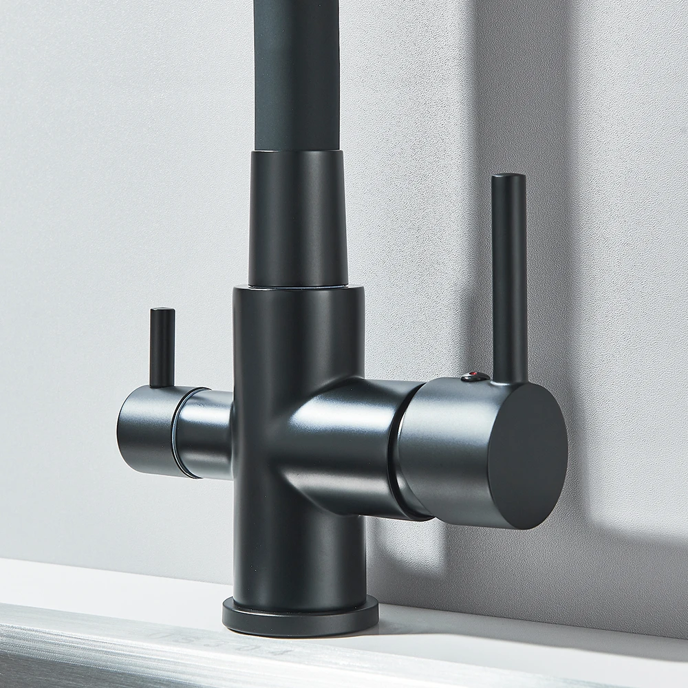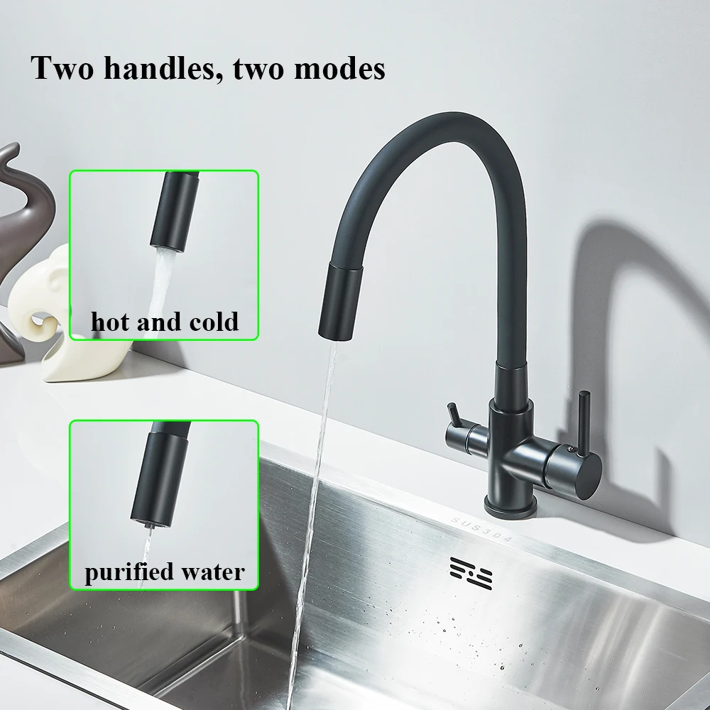 สีดําน้ําบริสุทธิ์ก๊อกน้ําห้องครัวท่อยืดหยุ่น Daul Handle น้ําร้อนเย็นผสมน้ําดื่มบริสุทธิ์กรองแตะหมุน