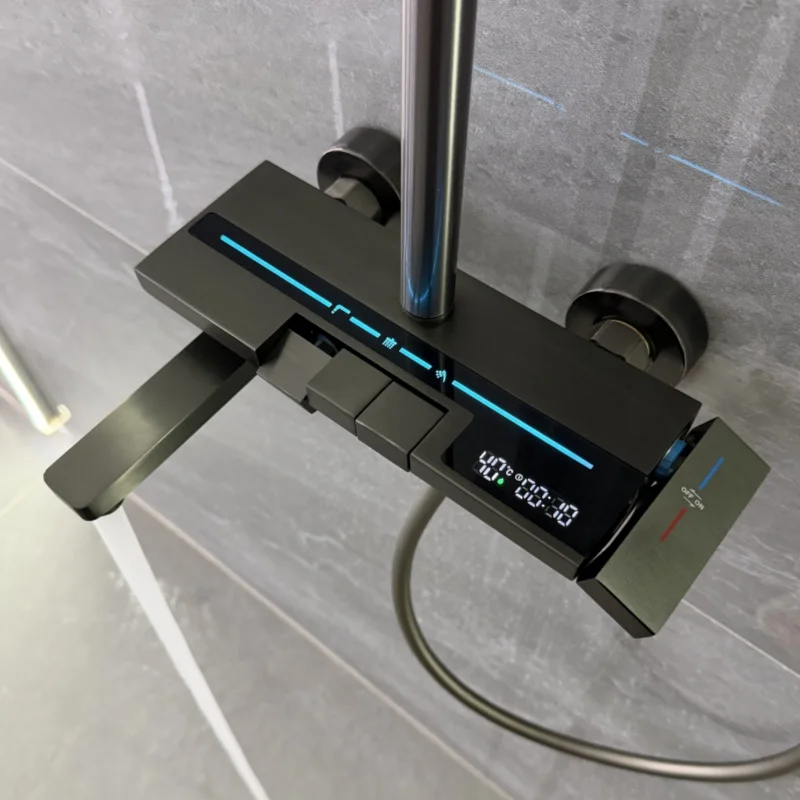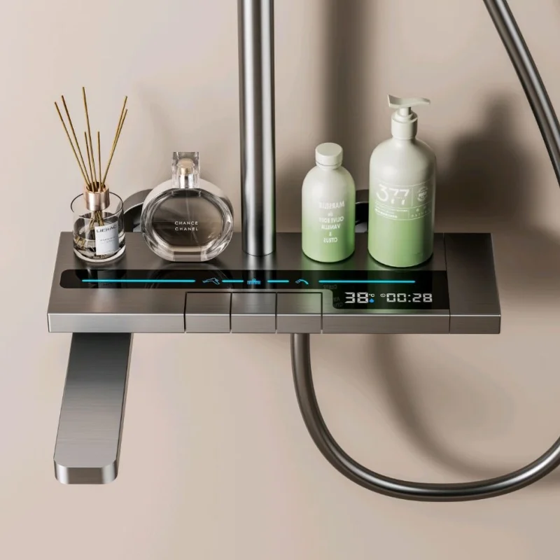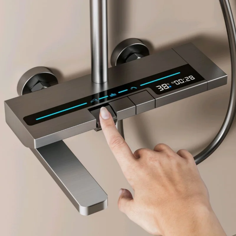 ชุดฝักบัวดิจิตอลแสดงอุณหภูมิ 4 ฟังก์ชั่น พร้อมก๊อกน้ำแบบปุ่มกดสำหรับอ่างอาบน้ำ ระบบผสมน้ำร้อนน้ำเย็น