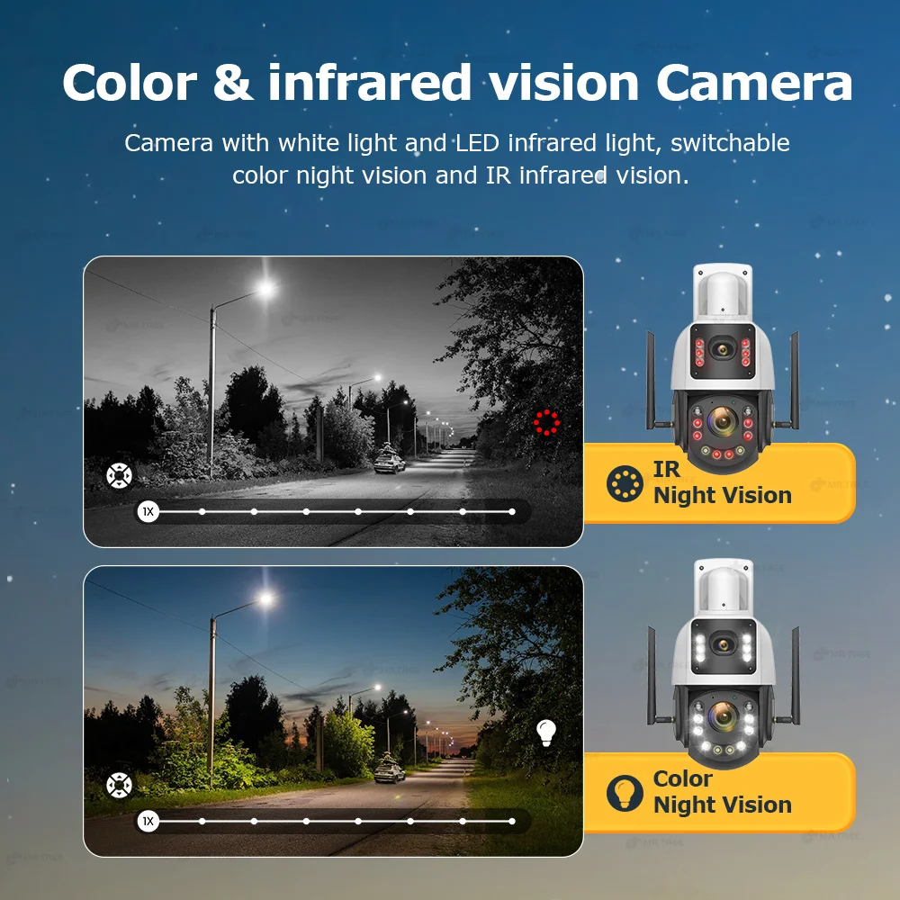 กล้องรักษาความปลอดภัยนี้รองรับการมองเห็นตอนกลางคืนสองโหมด การมองเห็นตอนกลางคืนแบบ IR เป็นสีดำและสีขาว การมองเห็นตอนกลางคืนแบบสีพร้อมมุมมองที่มีสีสัน