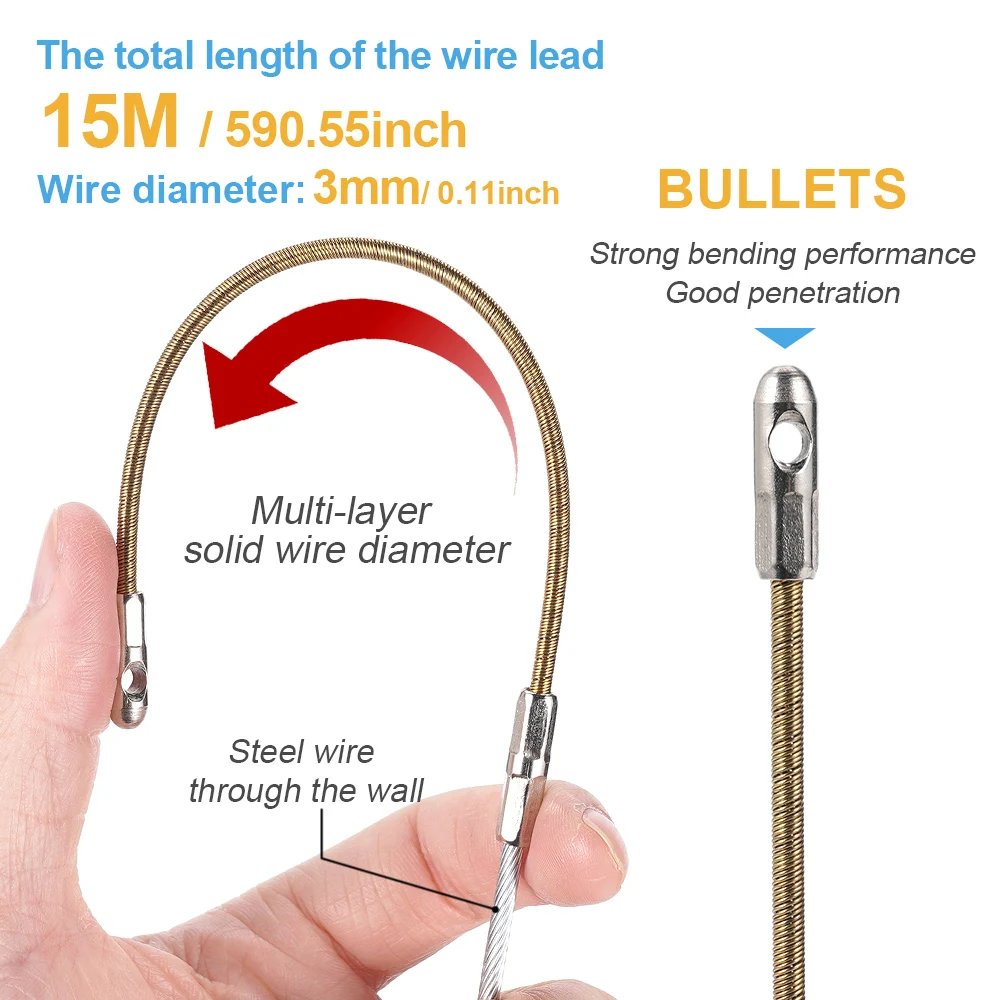 ลวดสปริงแบบ Bullet รุ่นอัปเกรดใหม่สำหรับการเดินสายผ่านผนัง เส้นผ่านศูนย์กลางสาย 3.0 มม. ความยาวสาย 15 เมตร มีความยืดหยุ่นสูงและทนต่อแรงดึงได้อย่างดีเยี่ยม