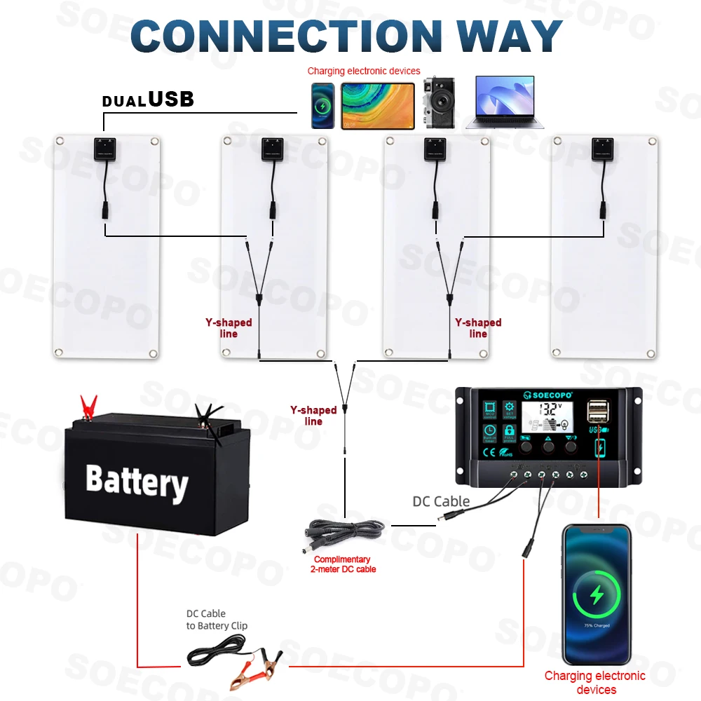 ชุดแผงโซลาร์เซลล์พกพา SOECOPO 800W: แผง 4*200W, แถมฟรีคอนโทรลเลอร์ 100A, USB 5V สำหรับอุปกรณ์ตั้งแคมป์ ชาร์จโทรศัพท์ในรถบ้าน