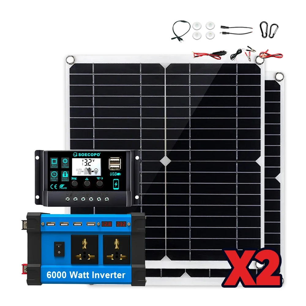 SOECOPO 6000W ชุดระบบพลังงานแสงอาทิตย์ 2*300W แผงพลังงานแสงอาทิตย์ 100A Controller Camping USB 5 V/1.5A DC 12 V – AC 110 V/220 V อินเวอร์เตอร์แผงบ้าน