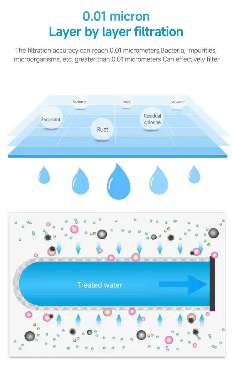 ความแม่นยำในการกรองสามารถไปถึง0.01ไมโครเมตรและแบคทีเรียสิ่งสกปรกจุลินทรีย์และสารอื่นๆที่มากกว่า0.01ไมโครเมตรสามารถกรองได้อย่างมีประสิทธิภาพเพื่อให้ได้น้ำดื่มที่ดีต่อสุขภาพและน้ำดื่มที่ดีต่อสุขภาพ