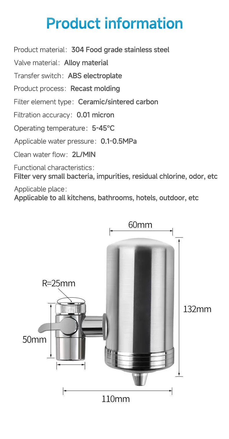 • ติดตั้งง่าย:ด้วยการออกแบบที่เรียบง่ายเครื่องกรองน้ำสำหรับก๊อกน้ำนี้ติดตั้งง่ายและสามารถติดกับก๊อกน้ำที่มีอยู่ของคุณได้อย่างง่ายดาย