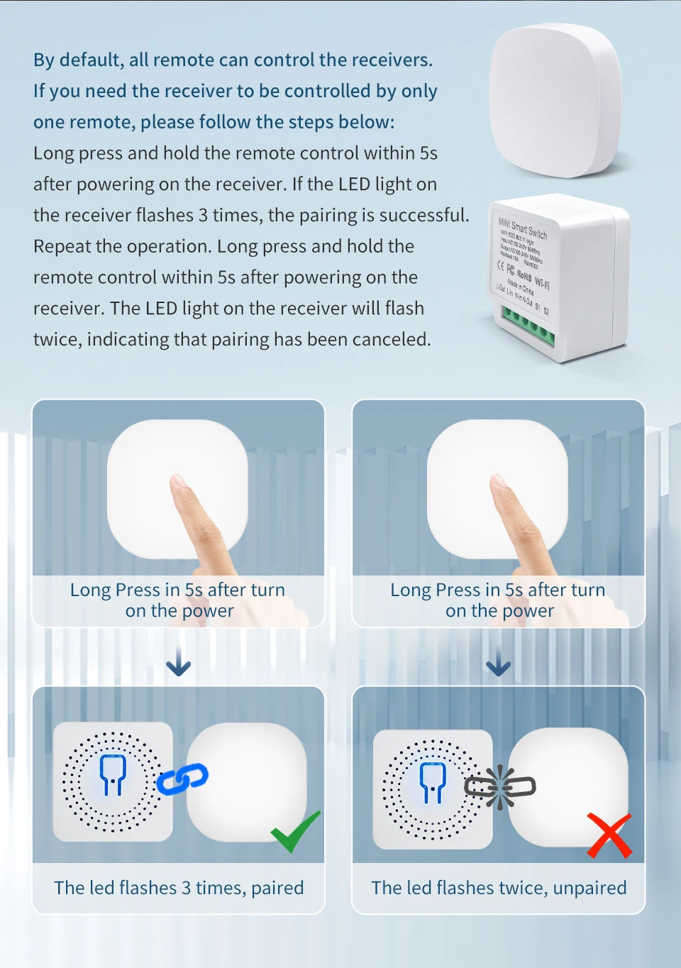 2.รีโมทคอนโทรล RF 2.4G ของเราตรงกับสวิตช์อัจฉริยะทั้งหมดในลิงก์นี้ ดังนั้นคุณจึงสามารถซื้อรีโมทและควบคุมสวิตช์หลายตัวได้